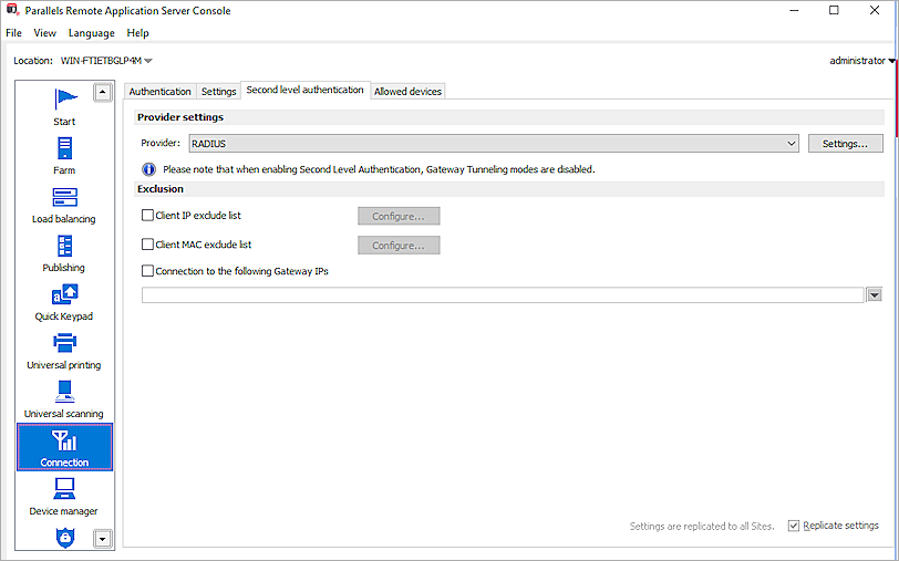 Parallels RAS can be configured to support MFA in several modes. For this integration, we set up RADIUS with AuthPoint. This integration was tested with Parallels RAS v17.0.