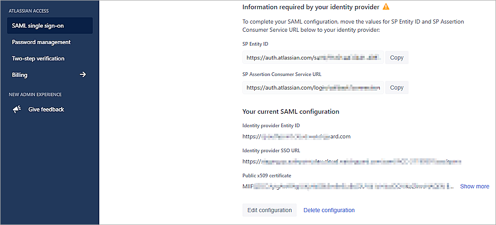 - In the Service Provider Entity ID text box, type https://auth.atlassian.com/saml/<your id>. This is the SP Entity ID value from the SAML single sign-on page in Stride.