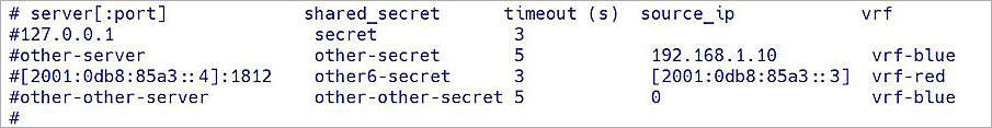 - Edit the /etc/pam_radius_auth.conf file and comment out the default lines.