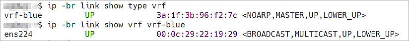After you create a VRF, you can use the command $ ip -br link show type vrf to list the VRF, and the command $ ip -br link show vrf vrf name to display the device assigned to the VRF.