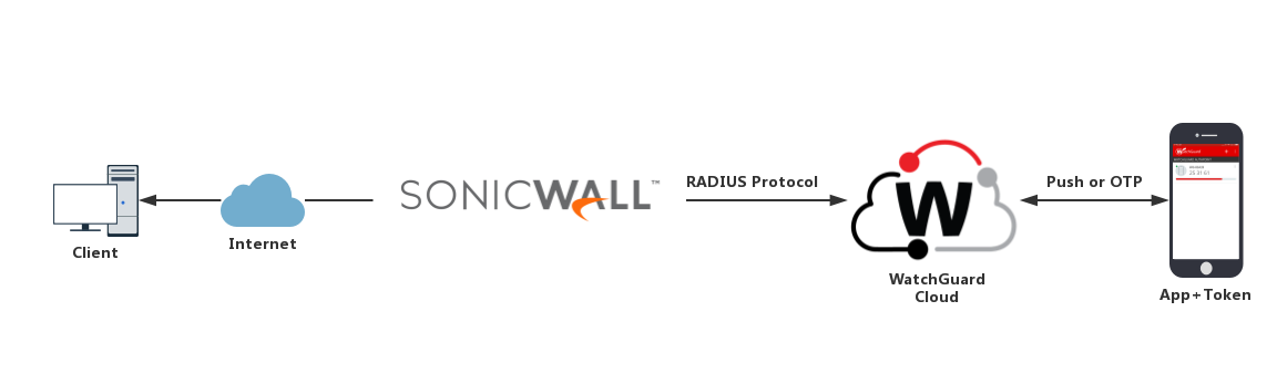 AuthPoint communicates with various cloud-based services and service providers with the RADIUS protocol. This diagram shows the data flow of an MFA transaction for a SonicWall Network Security Appliance.