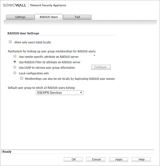 To use the RADIUS authentication with SonicWall Network Security Appliance, a RADIUS server (the AuthPoint Gateway) must be configured in the users configuration.