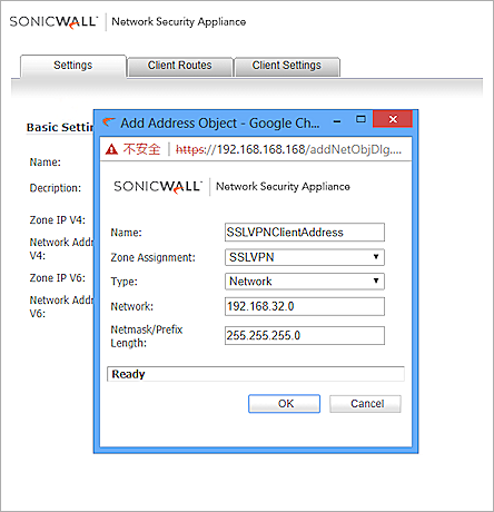 - In the Server text box, type the SonicWall Network Security Appliance WAN Interface IP address and SSL VPN port.