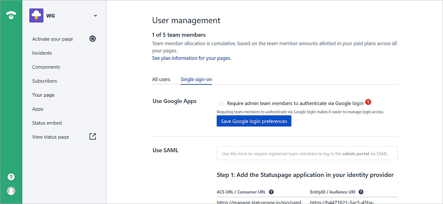 - In the Service Provider Entity ID text box, type the EntityID / Audience URI value from the Single Sign-on page in Statuspage.