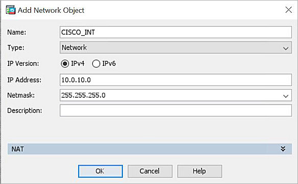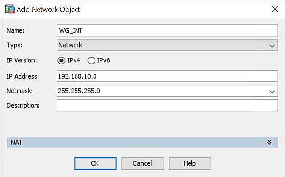 - Repeat Steps 20–26 to create another network object. For this example, we name the network object CISCO_INT. This is used for the network protected by the Cisco ASA.