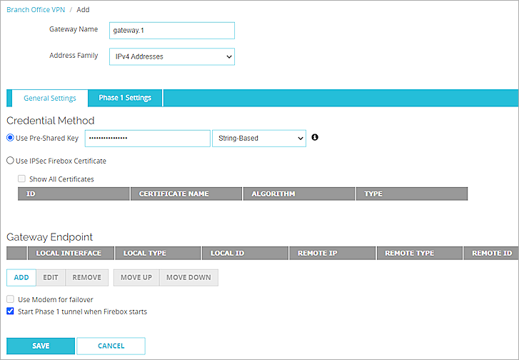 - In the Gateway Endpoint section, select the Start Phase 1 tunnel when Firebox starts check box.