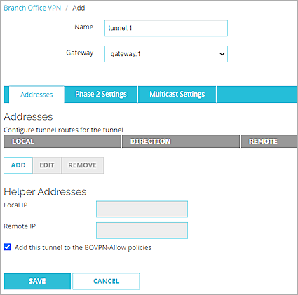 The Branch Office VPN configuration page opens. - In the Gateways section, click Add.