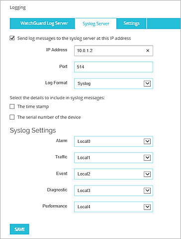 - In the Syslog Server section, select the Send log messages to the syslog server at this IP address check box.