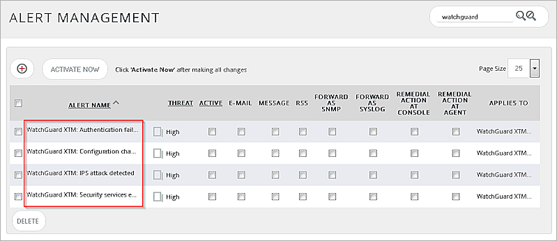 - In the search box, type WatchGuard, and then click Search. The Alert Management page displays all the imported alerts.
