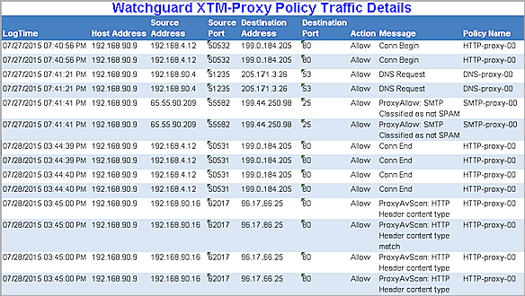 | Jun 19 11:19:22 192.168.90.9 Jun 19 11:20:28 CADM-XTM-520 (2015-06-19T15:20:28) Allow Firebox 0-External 52 tcp 20 127 10.0.1.2 125.156.60.25 62443 80 offset 8 S 832026162 win 8192 (HTTP-00) |