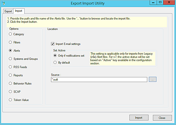 - To activate the imported alerts, select the associated check boxes in the Active column and then click Activate Now.