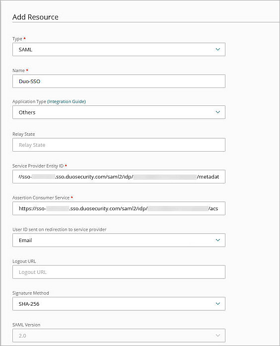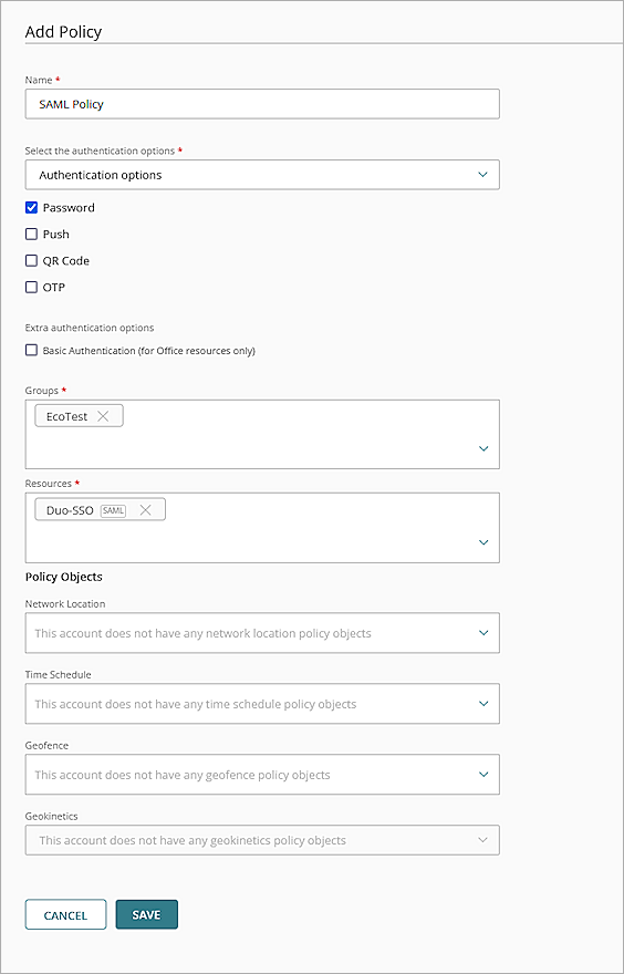 - From the Authentication Server drop-down list, select the SAML authentication server you created. In this example, we select Duo-SAML.