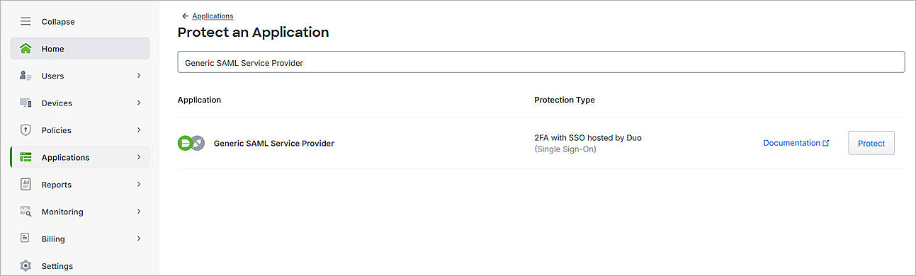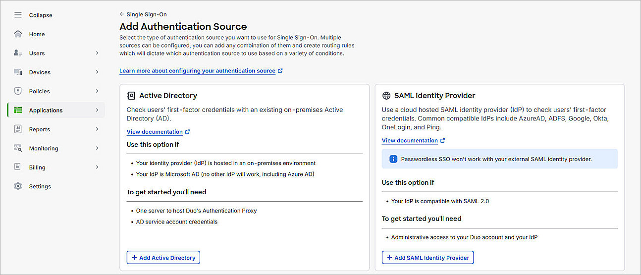 By default, your primary authentication source is configured as an authentication source for your routing rule. For additional authentication sources, make sure to set the default rule to the SAML authentication source you need. Alternatively, you can add a routing rule. For more information, go to How to Use Duo Single Sign-On in the Duo documentation.