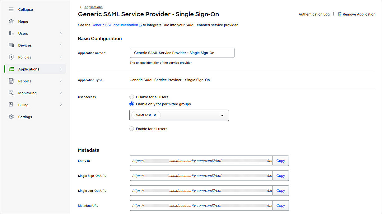 - In the Service Provider Entity ID text box, type or paste the EntityID value you copied in the Configure AuthPoint as an Identity Provider in Duo section.