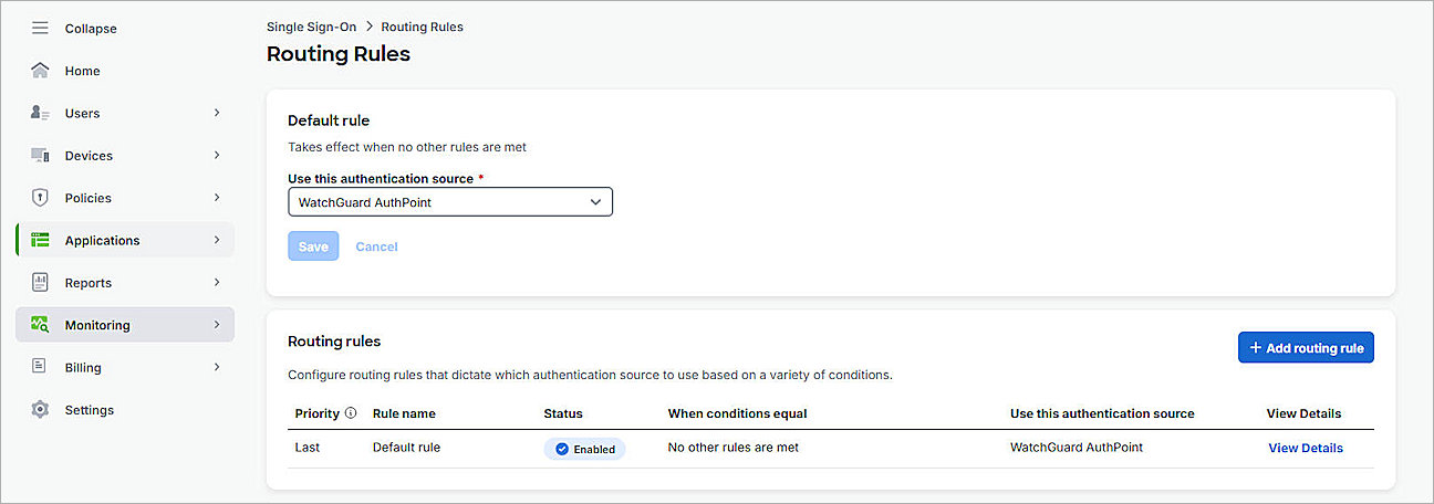 The Routing Rules page opens. - From the Use this Authentication Source drop-down list, select the SAML Identity Provider authentication source you added in the Configure AuthPoint as an Identity Provider in Duo section. In this example, we select WatchGuard AuthPoint.