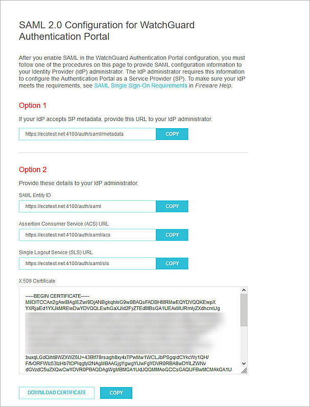 The SAML 2.0 Configuration for WatchGuard Authentication Portal page opens. - From the Option 2 section, copy these values of these parameters to use when you create a SAML application in Duo: