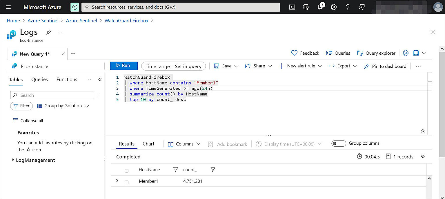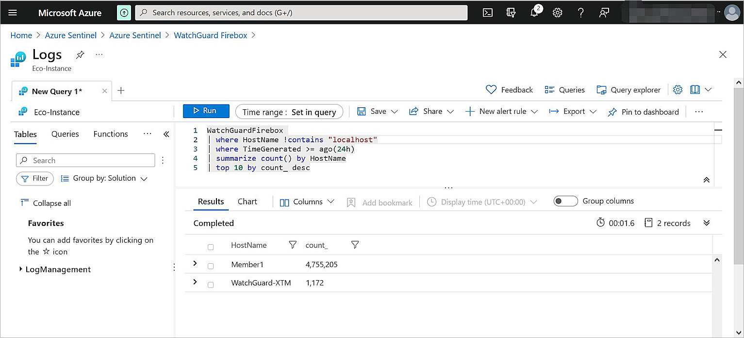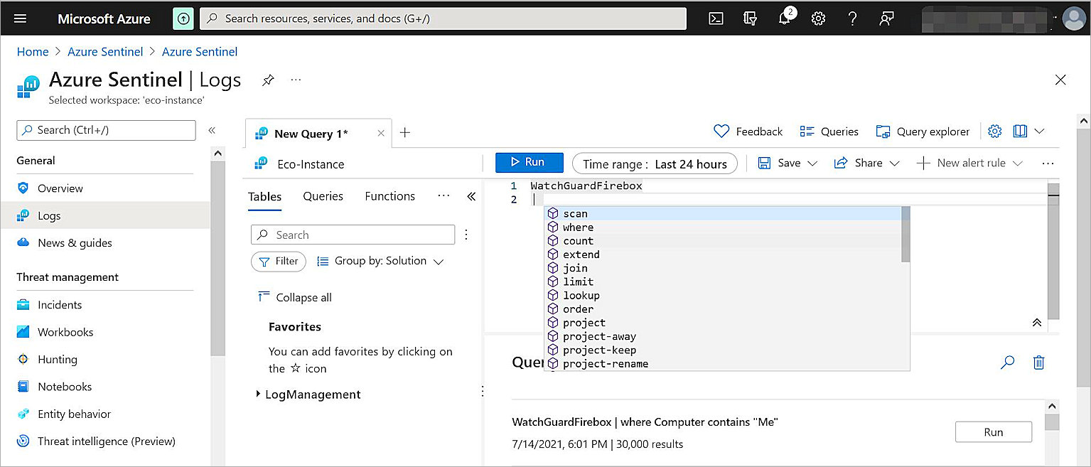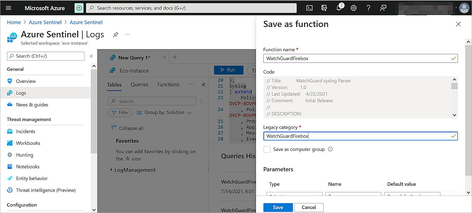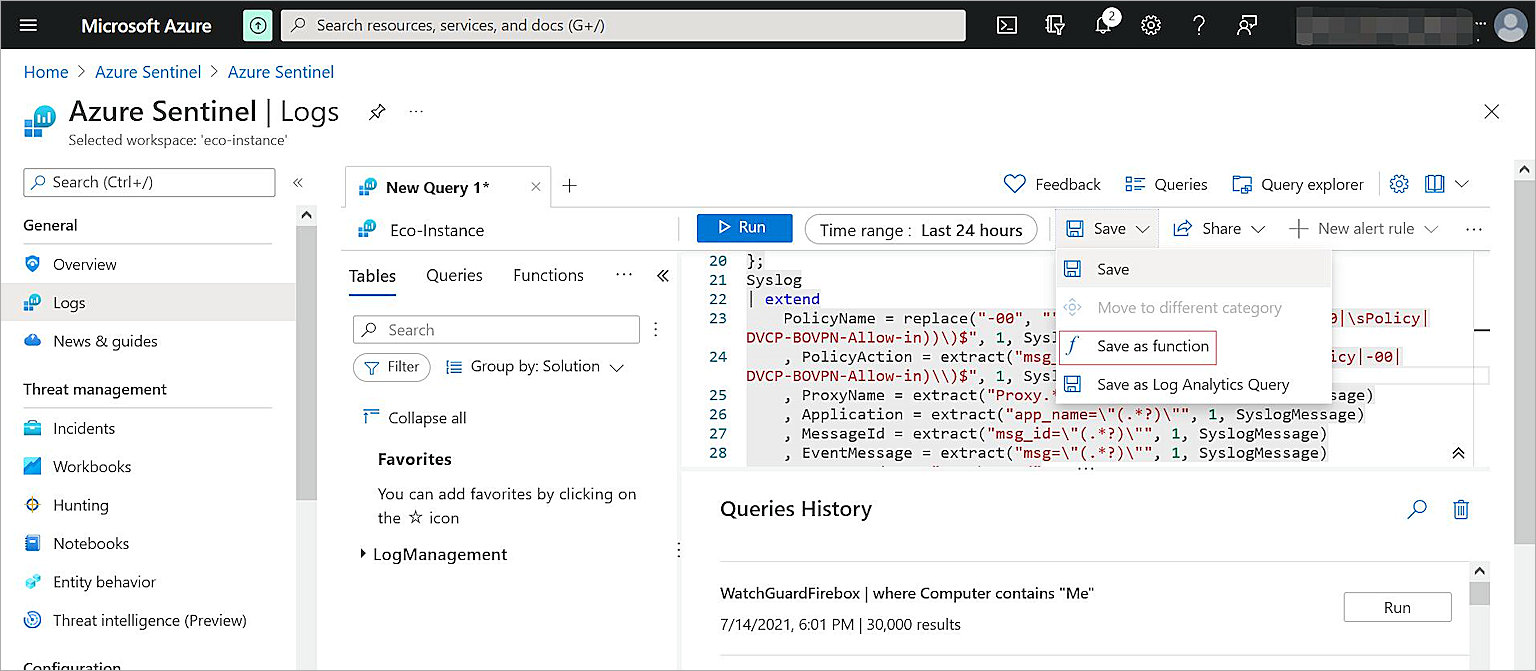26. Verify that the WatchGuardFirebox function exists and that Microsoft Sentinel can analyze the function.