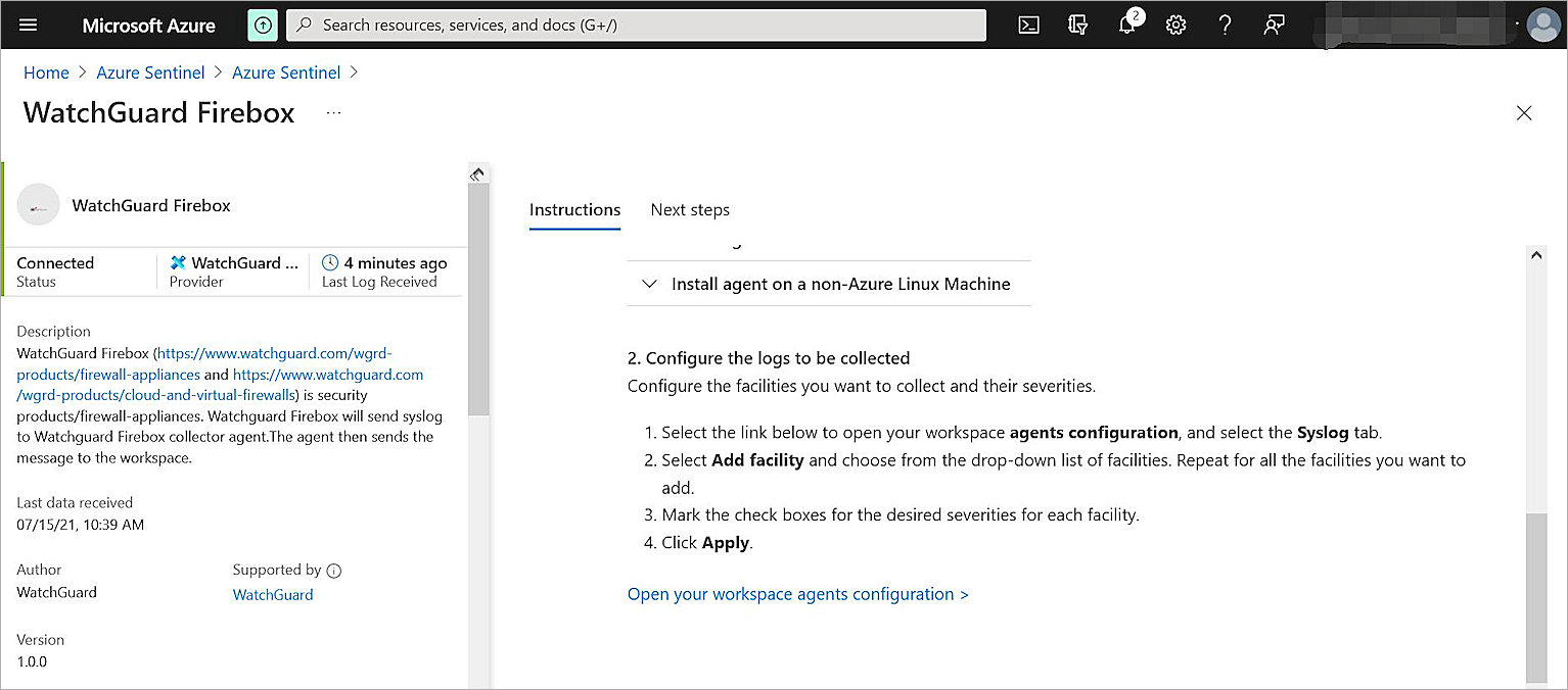 17. After you install the Microsoft Monitoring Agent and configure it with the keys for your workspace ID, return to the WatchGuard Firebox connector page and click Open Your Workspace Agents Configuration .