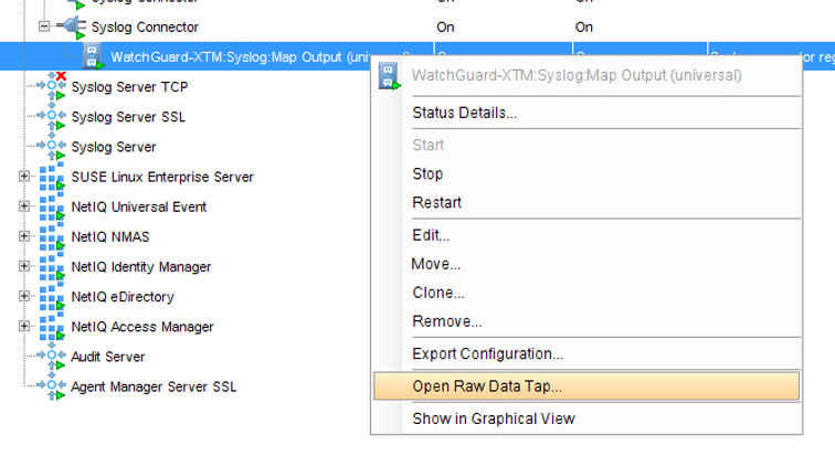 - Right-click WatchGuard-XTM:Syslog:Map OutPut (universal) and select Open Raw Data Tap.
