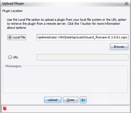 - Find a supported WatchGuard plugin file. Click Select.