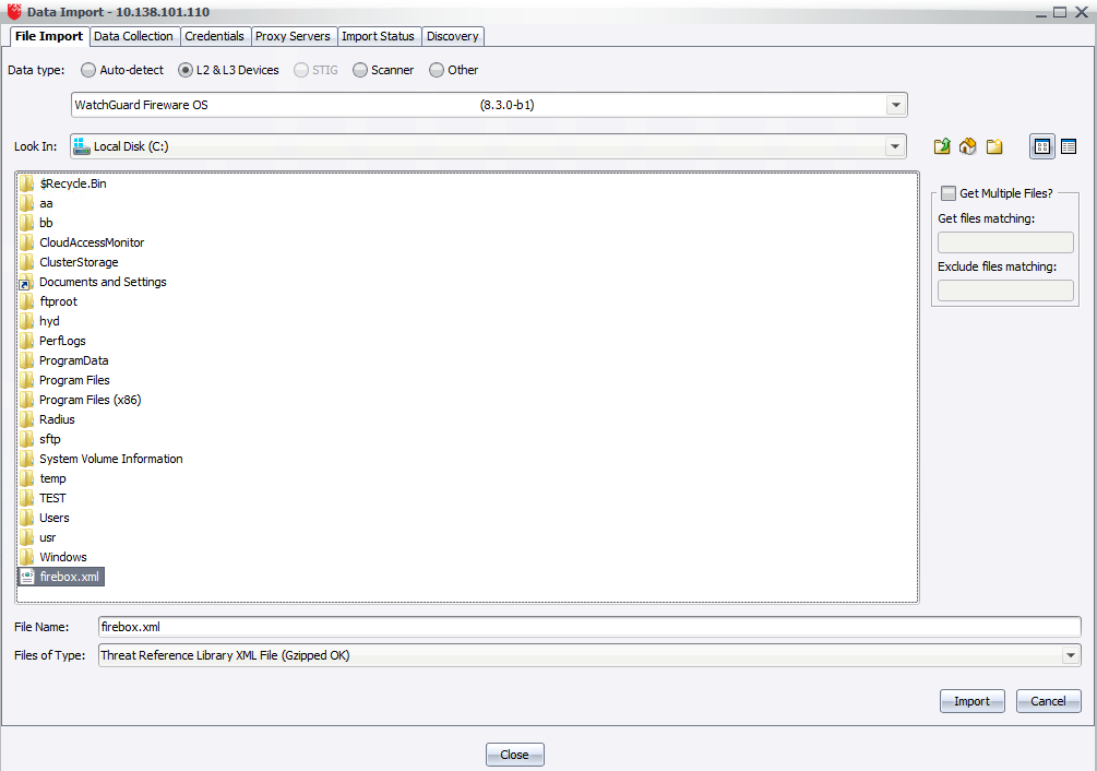 - Select one or more configuration files that you want to import. In our example, we import a Firebox.xml configuration file.