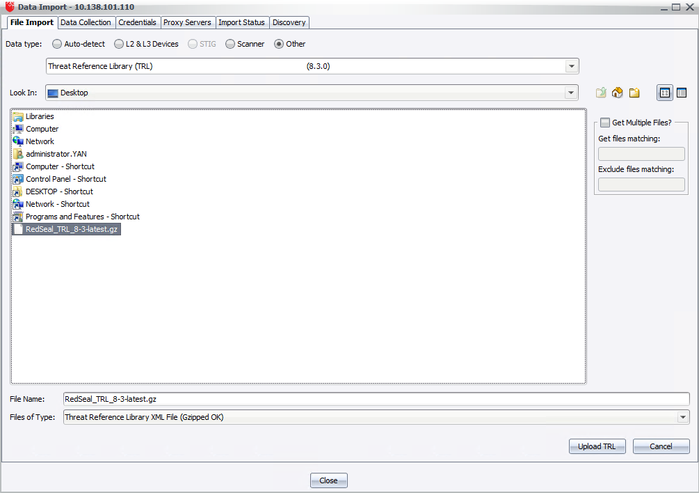 - Select the TRL file that you want to import. In our example, we import RedSeal_TRL_8-3-latest.gz.