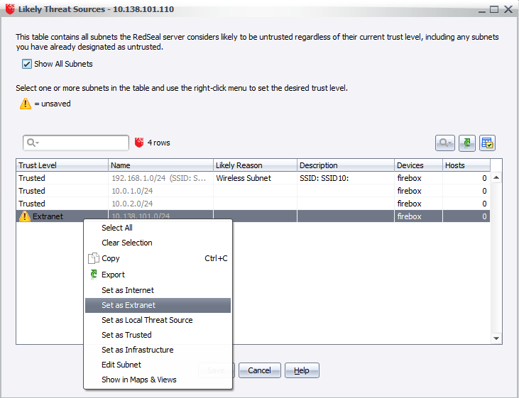 - To select the subnets that you want to identify, right-click a subnet from the list. In our example, we select one Extranet.