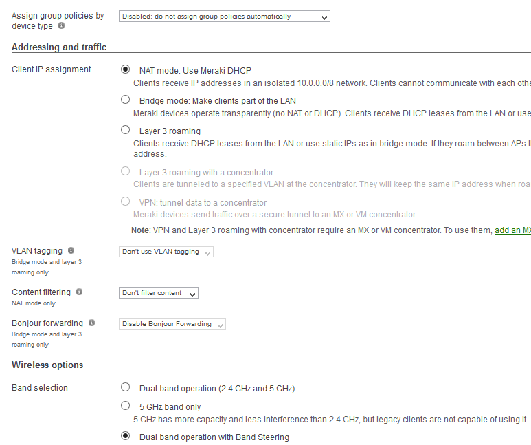 - In the Addressing and traffic section, for Client IP assignment, select NAT mode: Use Meraki DHCP.