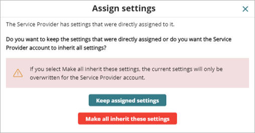 - Keep assigned settings — When you select this option, the managed Service Provider account keeps their existing settings. Existing settings are retained and the application of new inherited settings stops at the first account with directly configured settings.