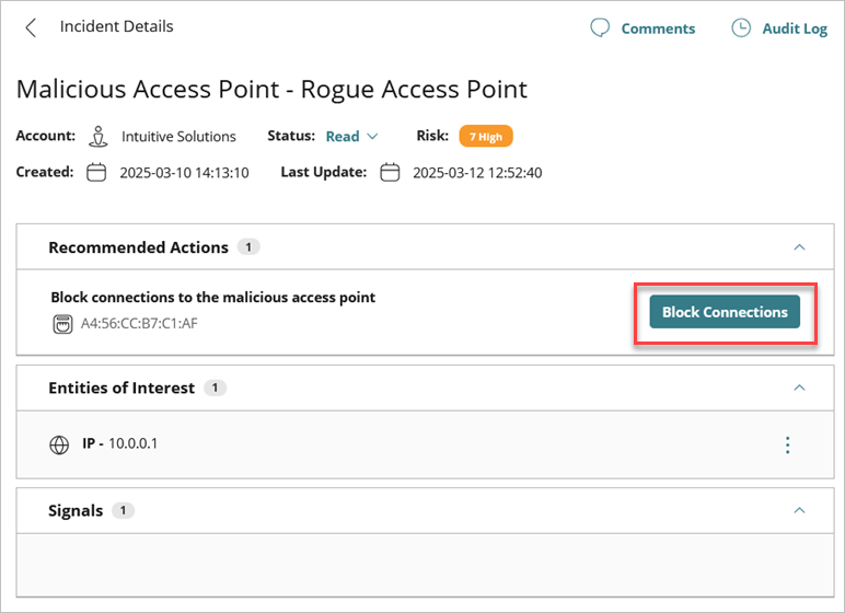 Select a specific incident to view the incident details. Click Block Connections to block wireless client connections to the malicious access points.