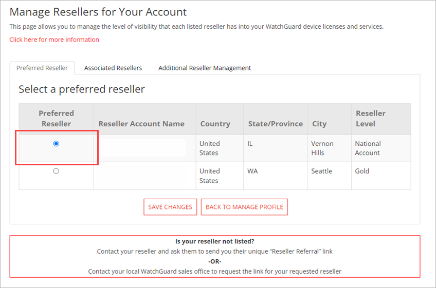 The Preferred Reseller tab includes all WatchGuard resellers associated with your account. You can select only one preferred reseller for your account.