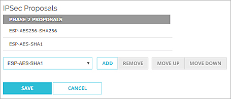 You can configure a tunnel to offer a peer more than one proposal for Phase 2 of the IKE. For example, you could specify [ESP]-[AES256]-[SHA2-256] in one proposal and [ESP]-[AES128]-[SHA1] in a second proposal. When traffic passes through the tunnel, the security association can use either [ESP]-[AES256]-[SHA2-256] or [ESP]-[AES128]-[SHA1] to match the transform settings on the peer. For more information about these options, go to About IPSec Algorithms and Protocols.