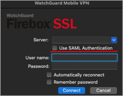 In Fireware v12.11 or higher, you can configure Mobile VPN with SSL to use a Security Assertion Markup Language (SAML) identity provider as an authentication server. You can use SAML to authenticate users with your Firebox. With SAML, you can exchange data between an identity provider (IdP) and a service provider. For more information, go to Configure SAML Single Sign-On.