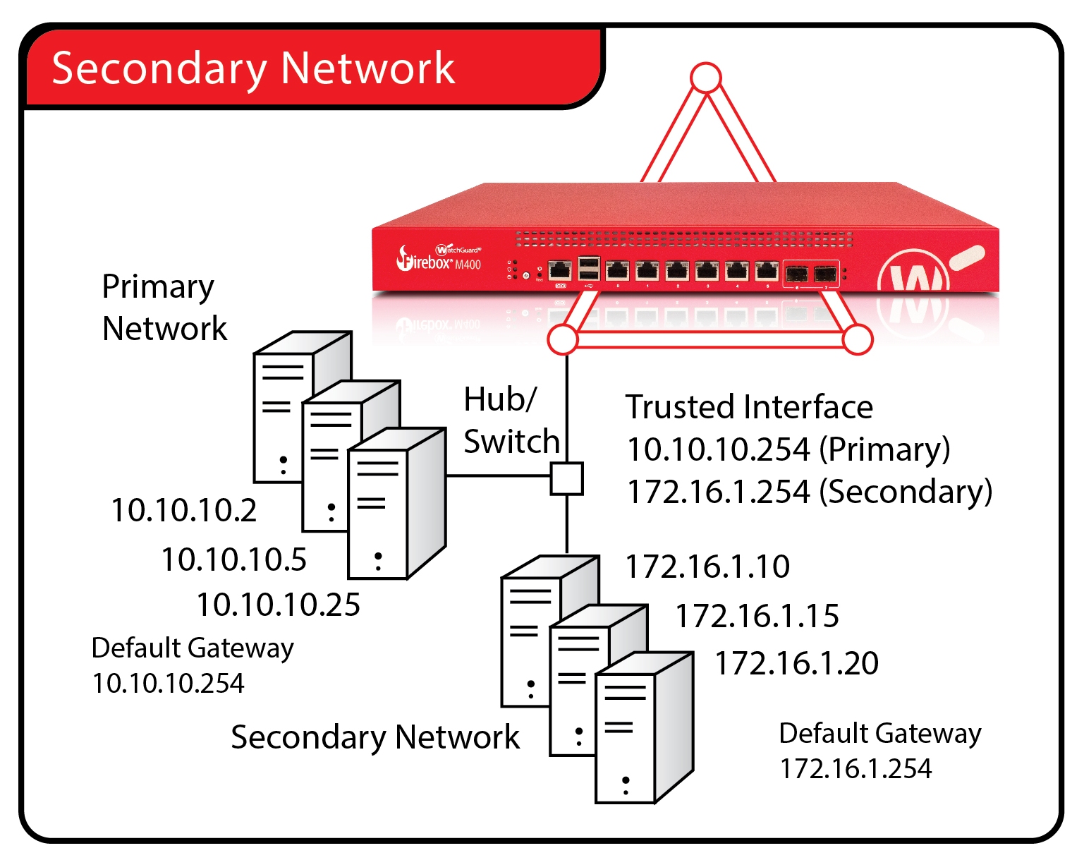 If the secondary IP address is on a different subnet from the primary IP address of the interface, it tells the Firebox that there is one more network on the Firebox interface. When you add a secondary network on a different subnet, the Firebox creates a route from any IP address on the secondary network to the IP address of the Firebox interface.
