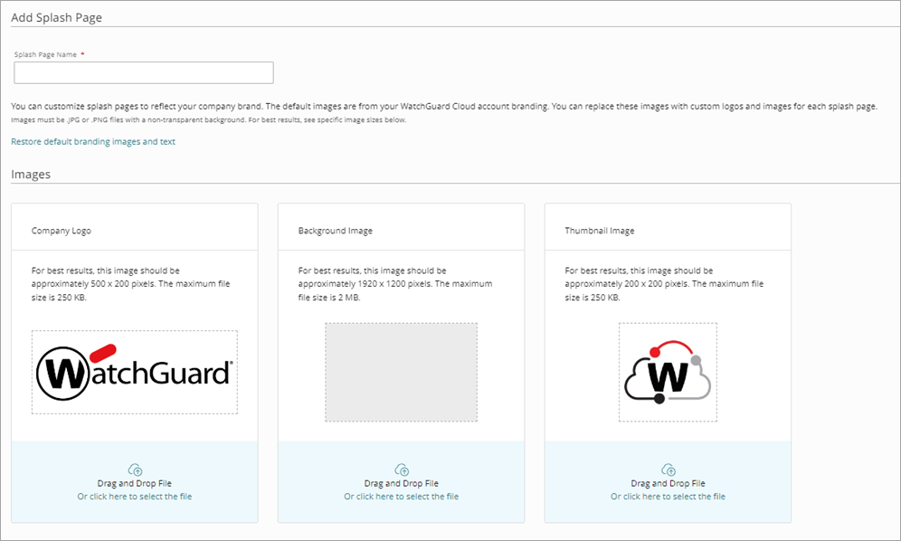 - To revert to the default images from your WatchGuard Cloud account branding, click Restore Default Branding Images and Text.