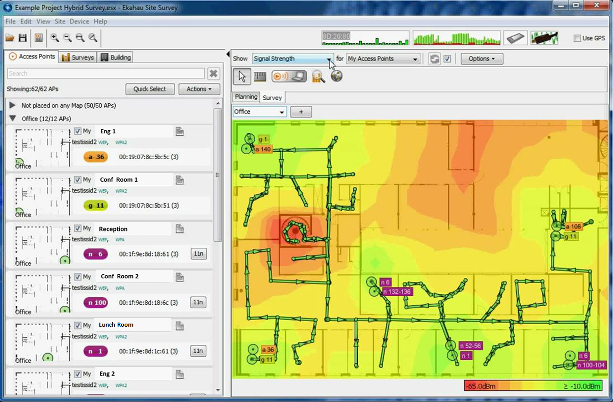 There are many post-deployment site survey tools available. The Ekahau Site Survey (ESS) is one of the most popular tools for this purpose. Like most site survey tools, ESS supports both passive and active site surveys.  An active survey measures sent packets and received packets. This mode is used to determine metrics such as packet loss and packet delay. A passive survey listens to probes and beacons passively and is useful for creation of coverage and SNR (Signal to Noise Ratio) maps. ESS also supports a hybrid survey mode that simultaneously performs a passive and active survey. We recommend you use the hybrid mode.