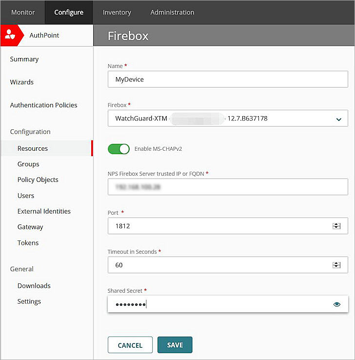 - Add the Firebox as a Firebox resource in AuthPoint.