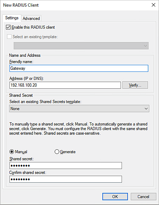 - In the Shared Secret and Confirm Secret text boxes, type the shared secret key that you specified in the Configure Microsoft NPS Server section. This is the password that the RADIUS server (AuthPoint Gateway) and the RADIUS client (Firebox) will use to communicate.