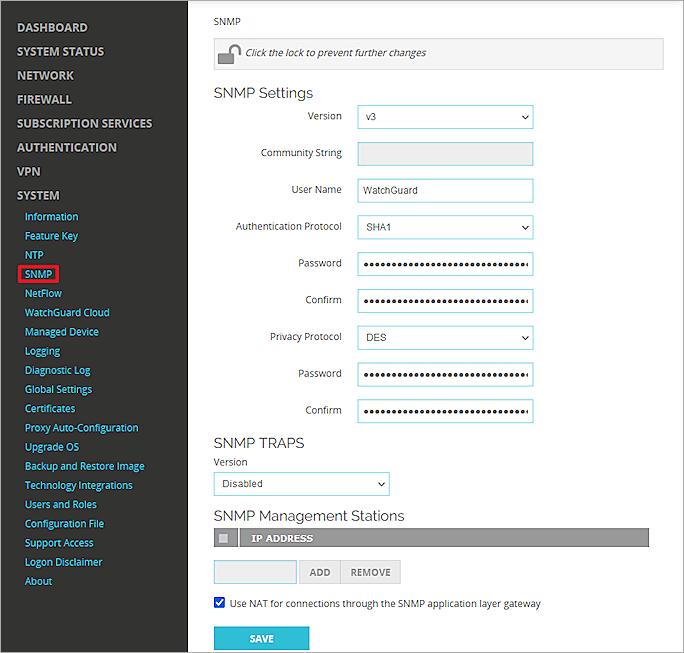 - Configure the same SNMP authentication method, encryption method, and credentials that you configured in the Set Up the Firebox section.