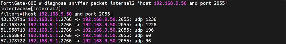 diagnose sniffer packet internal2 'host 192.168.9.50 and 2055'