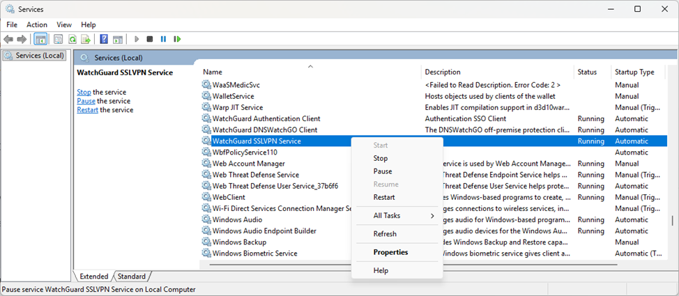 - The WatchGuard SSLVPN Service shows a status of Stopped or Disabled in the Windows Services list.