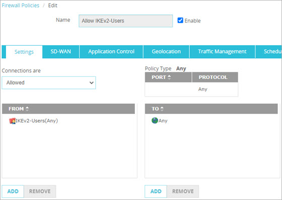 For example, the SSH Traversal policy in the Policies That Allow Connections from VLANs section works for the Support group regardless of whether they are inside the network or on a VPN. This works if you add the Support user group in the Mobile VPN with IKEv2 configuration.