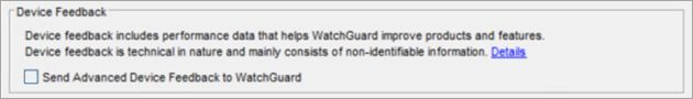 If you do not want to send advanced device feedback to WatchGuard, you can disable it at any time. To disable advanced device feedback on your Firebox, clear the Send Advanced Device Feedback to WatchGuard check box.