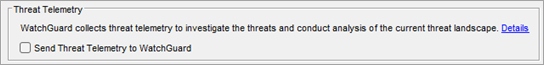 If you do not want to send threat telemetry data to WatchGuard, you can disable this feature. To disable threat telemetry feedback on your Firebox, clear the Send Threat Telemetry to WatchGuard check box.