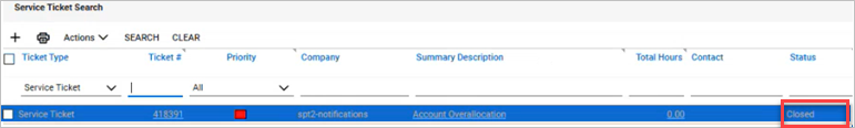 When you resolve the overallocation issue in the managed account, WatchGuard Cloud generates another alert, and ConnectWise automatically closes the ticket.