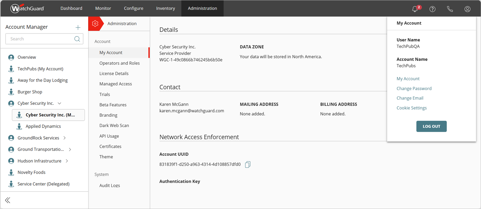 Your operator role determines what you can see and do in WatchGuard Cloud. Your role must have the Manage Tenants permission to view or configure this feature. For more information, go to Manage WatchGuard Cloud Operators and Roles.