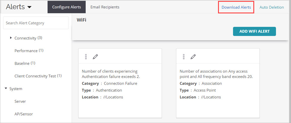 To download and view a full list of alerts that Wi-Fi Cloud generates, click Download Alerts. To view a summary of possible alerts, see Wi-Fi Cloud Events and Alerts.