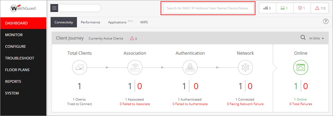 The search feature is located on the top of each page in Discover. You can search for a client or AP by MAC address, IP address, user name, or device name.