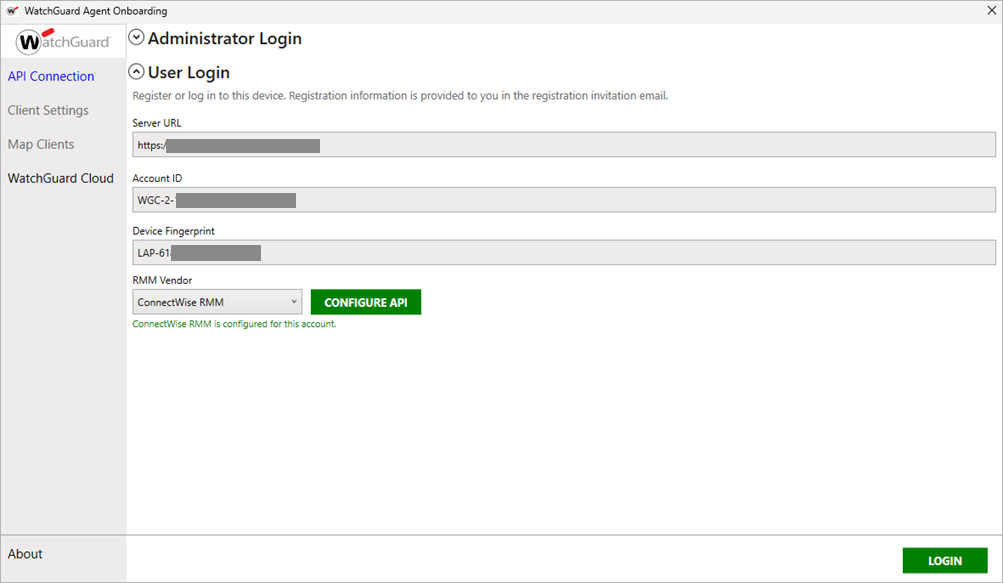 The Administrator Login interface opens. - Enter the API information for WatchGuard Cloud: