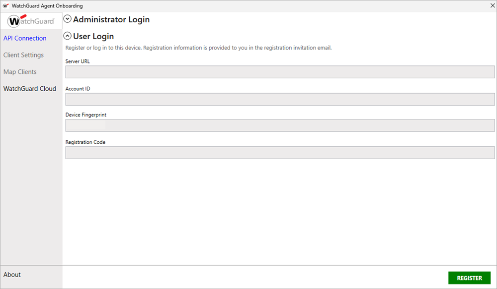 If you do not have the API login information required to connect as an Administrator, you can use the User Login interface. Before you can establish the connection between WatchGuard Cloud and ConnectWise RMM, you must first register as a device user in the onboarding application. Device registration is a one-time process for each device user, and the required registration information is provided in an invitation email from the administrator. The email contains this information: